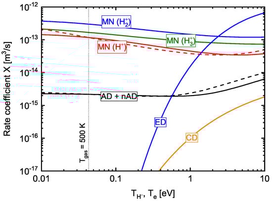 Rate coefficients of the different H destruction processes, calculated from the cross sections in [29] as functions of the electron temperature for the electron detachment process and of the temperature for the other processes. Solid lines correspond to fixed temperatures for neutral particles and positive ions of 500 K, while the dashed lines correspond to .