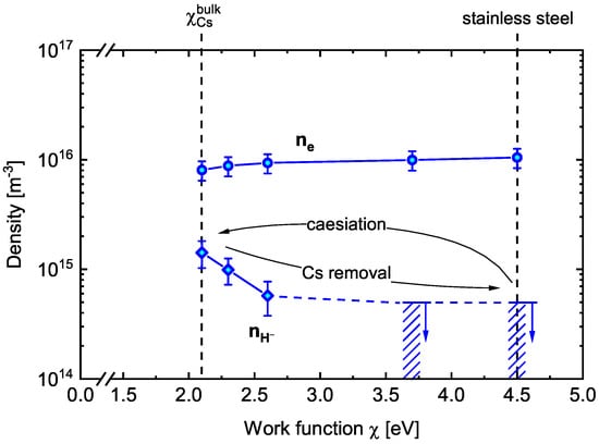 For the investigations in hydrogen and deuterium, the same procedure has been followed. For each measurement, a plasma pulse of at least one hour is performed: the negative ion density is measured at the end of the plasma pulse, while the work function immediately after the end of the pulse. The first measurement is performed with the non-caesiated stainless steel sample (work function of 4.5 eV) to measure the volume produced H density since the surface production is assumed to be negligible. The second measurement is taken at a work function of 2.1 eV, hence with a caesiated surface. The caesiation of the sample is performed during a continuous plasma operation of 5 h (as shown in [11]), where the Cs density is step-wise increased up to m corresponding to a flux of around ms. This flux assures a surface work function of 2.1 eV at the end of the plasma operation (plasma and caesium evaporation are switched off simultaneously), and the corresponding H density is measured. In order to vary the work function and collect measurements between 2.1 eV and 4.5 eV, plasma pulses of one hour each are performed without further Cs evaporation in the experiment. In fact, it is known from [11] that the plasma exposure can remove gradually caesium from the surface and consequently change the work function, if no fresh Cs is evaporated into the vessel. In this way, the H density for work function values in between 2.1 and 4.5 eV can be measured. After 5 h of total plasma exposure, the work function of the bare substrate (4.5 eV) is retrieved since the deposited caesium is completely removed from the surface, and the negative ion density is again measured and compared to the very first measurement (prior to the caesiation), finding a full agreement.