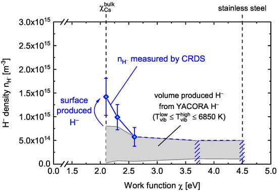 Caesiation, in combination with lowering the surface work function enhancing the surface production of negative ions, changes the plasma boundary in front of the surface, as already observed with the electron density. Thus, the influence of the changed plasma parameters on the H volume production is considered in the following. The volume production of negative ions is investigated with YACORA H for the plasma parameters measured at the different work function values. The different input parameters, such as the particles’ densities, the electron temperature, the gas temperature, and the lower vibrational temperature , can be estimated by measurements taken for each work function. Only the higher vibrational temperature is unknown, and this can be assessed via modeling the H volume production at 4.5 eV, where the surface contribution is assumed to be negligible and the measured H density can be matched to the modeled one by tuning . Since the negative ion density at eV is below the CRDS detection limit, an upper limit is given for using the detection limit of m as negative ion density, obtaining a high vibrational temperature of 6850 K. In order to take into account the uncertainty of the actual negative ion density, is assumed to lay in the range between , which at 4.5 eV is equal to 3500 K, and 6850 K. Taking all the measured plasma parameters with their error bars and the evaluated range, the volume produced negative ion density is calculated using YACORA H for the plasma parameters at each work function point. The respective range of volume produced negative ion density is shown in Figure 4 as a gray shaded area, including the lowest and the highest possible value for the volume produced H density.