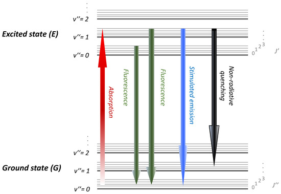 The primary processes observed in a molecular system (e.g., OH, NO, CO, etc.) when applying LIF are illustrated in Figure 1. The molecule being initially at a specific rovibrational level () of its ground state (G), absorbs a laser photon and reaches a different rovibrational level () of an excited fluorescing electronic state (E). The incident photon has an energy that is equal to the energy difference between levels E() and G(). Following the species excitation, photon emission occurs from the relaxation of the excited state to an allowed lower level, as imposed by the quantum selection rules for electronic dipole transitions [30,31]. In Figure 1, different processes can be distinguished: (1) absorption of a single UV photon (red arrow) leads to molecular excitation from the ground state G() to the higher-energy level E(), (2) stimulated emission (blue arrow), which is induced by the laser, leads to species de-excitation back to level G(); the loss of the density (N) of the laser-excited state through spontaneous emission is given by N AEG, where AEG is the Einstein coefficient of spontaneous emission for the transition between levels E() and G(). This loss process and/or collisional quenching (depending on the pressure and species type) can be dominant at low laser intensities. However, when the laser intensity is significantly increased, the loss of the excited state through stimulated emission becomes significant. In fact, the loss of the excited-state density through stimulated emission is given by NBEGI, where BEG is the Einstein coefficient for stimulated emission between the previous levels and I is the laser intensity. Therefore, with increasing laser intensity the effect from stimulated emission increases as well, (3) quenching (black arrow) due to collisions with species of the same or different nature; it increases strongly with the medium’s pressure, and induces a non-radiative de-population of the excited state, (4) pure fluorescence (green arrows) due to spontaneous emissions following the transition from the laser-excited state (or adjacent levels due to collisions, see below) to the ground state; it is essential for the determination of the species population density. On the above processes, one should also add possible collisional energy transfers. Due to these, the laser-excited state is excited/de-excited to adjacent energy levels, which are characterized by different rovibrational quantum numbers. It leads to emissions from excited states that were not directly populated by the laser. The above processes need to be taken into account when performing LIF experiments in order to deduce the pure fluorescence signal and achieve reliable density measurements. This can be achieved using adequate reaction-rate models based on molecular systems of a few energy levels [25,32]. In the following sections, similar processes will be discussed for TALIF diagnostics.