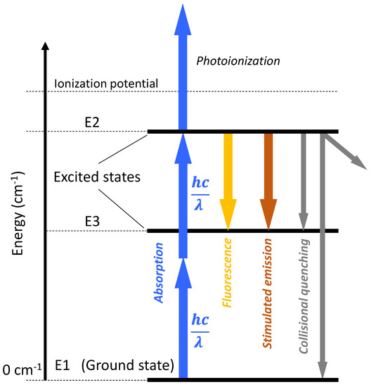 The potential use of TALIF for probing reactive atoms such as H, N and O has been demonstrated by some pioneering works in the 80′s [33,34,37,38]. Since then, a plethora of experimental and numerical studies has emerged. These studies validated the excellent capability of TALIF to determine atomic densities in flames and plasmas [28,36,39,40,41,42,43,44,45,46,47,48,49,50,51,52,53,54]. The concept of this method is depicted in Figure 2. For a given atom, a simplified three-level TALIF scheme can be employed. This figure depicts the dominant physical processes taking place after the two-photon excitation (blue) of the ground-state atom to an excited fluorescing level E2. These are the following: (1) pure fluorescence (orange) due to the radiative relaxation from E2 to a lower-energy level E3; it is necessary for the evaluation of the atom’s absolute density (see below), (2) photoionization (blue) from E2 by means of a third laser photon, (3) stimulated emission (brown) from E2 to E3, which results from a population inversion between E2 and E3, and (4) collisional quenching (grey) from E2 to other states such as the E3 and the ground state. The latter depends strongly on the pressure of the probed medium. This scheme is simpler than that of LIF shown in Figure 1 since rovibrational degrees of freedom are not associated with atomic species [31]. The above-mentioned processes will be discussed in more detail in the next sections.