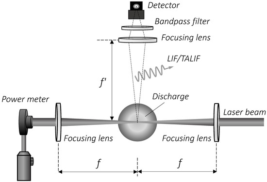 Figure 3 depicts a simplified experimental setup that can be used to perform TALIF diagnostics, e.g., when studying an electric discharge (this holds for other reactive media as well such as flames). The discharge can be produced in different gases (e.g., N2, O2, H2, He/O2/N2, Ar/N2, etc.), and ignited over a large range of pressures (from low to atmospheric or even higher). Using adequate focusing lenses, the laser beam can be focused to the zone of TALIF collection, and then guided to an energy meter. The laser operates in pulsed mode (with ns, ps or fs pulse duration) at a typical repetition frequency of a few Hz (higher frequencies can also be available [45,61]). A selection of pulsed lasers used in the literature for probing very common reactive atoms (H, N, and O) in gas discharges and flames is given in Table 1 and Table 2 referring to ns– and ps/fs–TALIF, respectively. As already mentioned, a feature of the fluorescence is that it is emitted isotropically. The related transitions lie in the VIS–NIR spectral range (see Table 1 and Table 2). Thus, it can be collected at various angles with respect to the laser beam. However, in most of the cases, ΤALIF is acquired at a 90° angle, as shown in Figure 3, to achieve the optimal spatial resolution while filtering out the laser beam and stimulated emission spatially. The collection of fluorescence is achieved using another focusing lens and a narrow bandpass filter to filter out any stray light that can interfere with the TALIF signal. In many works, high-resolution spectrometers are preferred for the precise selection of the wavelength of interest [62]. The TALIF signal is then recorded with fast detectors mounted at the exit of the spectrometer. These must present time responses that are much shorter than the characteristic decay time of the fluorescing species in order to record the signal reliably. A representative example can be found in [61]. The authors measured by means of ns–TALIF the atomic oxygen density in a microwave plasma jet operating in a gas mixture of He and dry air at atmospheric pressure. The laser used had a pulse duration of a few ns and peak energy of 1–3 μJ, and was operated at a repetition frequency of 1–2 kHz. TALIF was detected using a monochromator coupled with a photomultiplier tube, which was operated in the photon counting mode achieving a time resolution of 1 ns. This resolution was sufficient to resolve temporally the TALIF decay.
