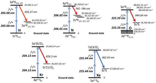 Figure 4 illustrates the UV laser wavelengths needed for two–photon excitation of H, N, O, Kr and Xe from their ground to different excited fluorescing states. The corresponding fluorescence wavelengths are also shown. Based on these schemes and Equations (4) and (5), the absolute density of a species of interest () is obtained, knowing the absolute density of the calibrating species (), as follows: