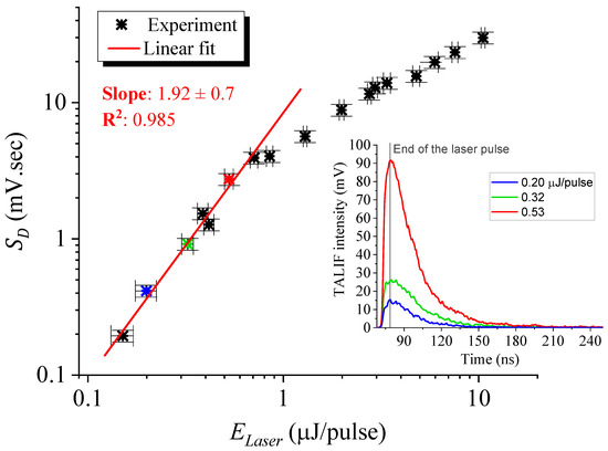 Another necessity when performing absolute density measurements of atomic species is the selection of appropriate laser energies, for which the consideration of Equations (5) and (6) is valid. This happens only when the measured TALIF signal intensity () is proportional to the squared laser energy (). This condition is known as the quadratic regime of excitation, and is achieved when the following two requirements are fulfilled [55]: