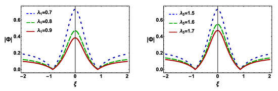 We have numerically analyzed first-order rogue waves [using Equation (28)] in Figure 2. The left panel of Figure 2 highlights the effects of the mass and charge state of the positive and negative dust grains (via ) in recognizing the shape of the DARWs in an EDDPM, and it can be manifested from this figure that (a) the increase in the value of does not only cause to change the amplitude of the DARWs but also causes to change the width of the DARWs; (b) the amplitude and width of the DARWs decrease with the increase in the value of ; (c) actually, the nonlinearity of the plasma medium as well as the amplitude of the DARWs increases with increasing , while the nonlinearity as well as the amplitude of the DARWs decreases with increasing for a fixed value of and . The right panel of Figure 2 reflects how the number density and charge state of the positive ion and dust grains (via ) can contribute to generate highly energetic rogue waves in a four-component EDDPM. The amplitude and width of the electrostatic DARWs associated with DAWs decreases with an increase in the value of positive ion charge state and number density, while increases with an increase in the value of positive dust grain charge state and number density. The physics of this result is that the nonlinearity of a four-component EDDPM increases (decreases) with positive dust grain (negative ion) number density as well as with positive dust grain (negative ion) charge state.