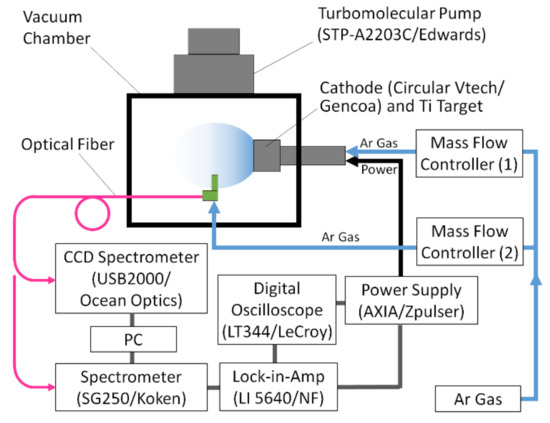 OES spectra of the plasma were sampled using an optical fiber mounted in the sputtering source chamber, and the emission spectra were measured with a CCD spectrometer (Ocean Optics, USB2000, Dunedin, FL, USA). Additional argon gas was introduced at a flow rate of 50 sccm through the mass flow controller (2) shown in Figure 2 (Kofloc, CR-300, Nagoya, Japan) at 10 mm downstream from the target surface, so as to prevent the deposition of sputtered particles on the tip of the optical fiber. The optical fiber was used with a focusing system consisting of a commercially available L-type lens assembly which is a built-in collimating lens (Gencoa, Right angle lens assembly, Liverpool, UK). The emission intensity obtained from the CCD spectrometer was calibrated for the wavelength range from 200 nm to 800 nm using a standard light source (Photo Research, PR-2301, Chatsworthm, CA, USA). The assignment of atomic lines measured with the CCD spectrometer was confirmed by comparison with the results obtained using a wavelength-scanning type 25-cm spectrometer (Koken Kogyo, SG-250, Tokyo, Japan) [31]. A photomultiplier tube (Hamamatsu Photonics, R928, Hamamatsu, Japan) was used as the photodetector. Temporal profiles of the optical signal detected by the photomultiplier tube set on the 25-cm spectrometer were monitored and recorded with the digital storage oscilloscope.
