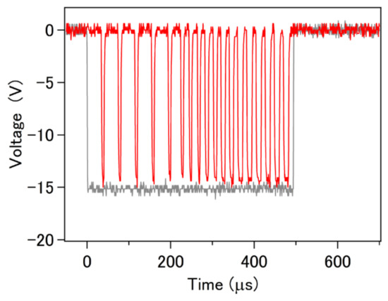 A micro-pulse train waveform (red line) and a sync macro pulse waveform (gray line) from the high-power pulse generator controlled by the MPP system. The rising edge of the sync macro pulse is 0 s of time.