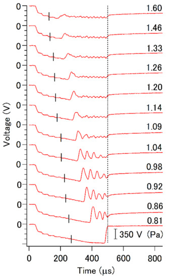 Discharge voltage waveforms (red lines) in MPPMS for working pressures in the range of 0.81–1.60 Pa. The minor tick interval of the voltage axis is −175 V/div. The black dotted line represents the cut-off time of the edge in a sync macro-pulse waveform output from the high-power pulsed generator controlled by an MPP system. The black short lines on the discharge voltage waveforms indicate the measured breakdown voltages as a function of argon pressure, which are described in previous paper in detail [28].