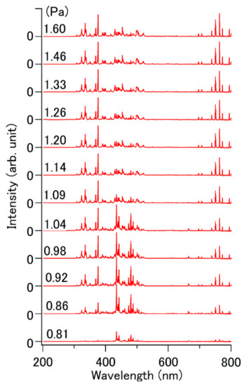 Figure 8 shows the emission intensities normalized with respect to the maximum emission intensity for each species as a function of the gas pressure. The atomic lines used in the plots in Figure 8 are selected emission lines in which the lower-energy levels are the ground state or close to the ground states that correspond to the terminal levels of the transition cascade on account of the tendency to reflect the population closer to that of the ground state [35]. The wavelength resolution of the spectrometer was not sufficiently high in the present experiment. However, we selected the atomic lines for which the lower states are the ground levels for Ti and Ti+ and the lower levels for Ar and Ar+ of low-energy lines, with the help of positive and negative signals in the difference spectrum shown in Figure 7. The atomic lines shown as the peaks marked with an asterisk in Figure 7 are summarized in Table 1 [35].