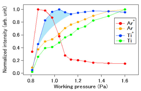 Figure 8 shows that the intensity of neutral species (Ti and Ar) tended to decrease monotonically with a reduction of the working pressure, whereas that of Ar+ sharply increased and reached a maximum at pressures lower than 1.14 Pa, and then steeply decreased at 0.81 Pa. The intensity of Ti+ ions slightly increased at a pressure lower than 1.14 Pa, began to decrease below 1.04 Pa and then decreased sharply below 0.86 Pa, with a decrease of the working pressure.