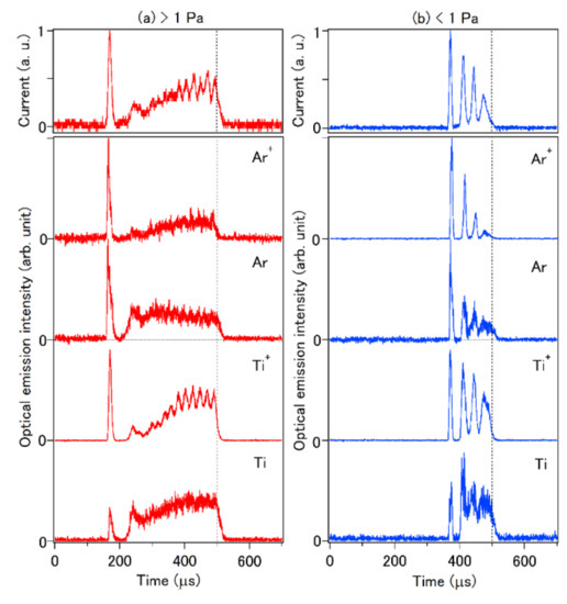 The generation of Ti+ is deeply related to the formation of Ar+ in the discharge generated by the comb-like current waveform. In detail, this suggests due to the number of pulses in the comb-like current waveform. To elucidate it, we observed the time profiles of the OES intensities to confirm the plasma stage for the comb-like current waveforms. Figure 9 shows temporal profiles of the atomic-line optical emission observed in the OES spectra for MPPMS at pressures (a) higher and (b) lower than 1 Pa, in addition to the current waveforms in MPPMS. The conditions are almost equivalent to those of (a) 1.33 Pa and (b) 0.92 Pa in Figure 3, respectively, although the actual pressures were sensitively dependent on the positions of the cathode magnet and the source geometries. At pressures higher than 1 Pa, the profiles were similar to the current waveform with a rising edge, except for Ar as reported for MPPMS plasma by Papa et al. [13] and for m-HiPIMS plasma by Fekete et al. [20] Excited Ar is an energy source for sputtered particles (Ti+ and Ti) and is the origin of Ar+; therefore, the optical emission decreases with time. On the other hand, for the result at lower than 1 Pa in DOMS-like plasma, the tendencies for the current waveforms of the gas particles (Ar+ and Ar) and the sputtered particles (Ti+ and Ti) with respect to the current waveform are slightly different.