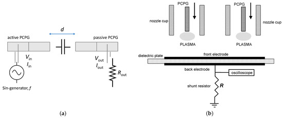 The high voltage tip of the PCPG was made of PZT ceramics and was not equipped with any electrically conducting electrode. Consequently, the direct voltage measurement of the PCPG output voltage was impossible. However, during operation, the PCPG produces a strong alternating electric field causing the plasma ignition. This field can be evaluated by the use of the large area capacitive probe. The details about this method and the signal interpretation were described in detail in [19]. The voltages measured by such probe are proportional to the kHz voltage on the tip of the PCPG. The proportionality factor is in the range. In this study, the capacitive large area probe was used to investigate the operation of a couple of PCPG working at a close distance from each other, as shown in Figure 1b.