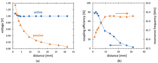 The energy coupling from active to passive PCPG (see Figure 1a) as a function of distance between the PCPG tips. (a) Voltages on the low voltage sides of the PCPGs. (b) The coupling efficiency and the resonance frequency of the active PCPG determined with 10 k load on the low voltage side of the passive PCPG. Both PCPGs used are of CeraPlasTM HF type. The signal on input of the active PCPG was sinusoidal with amplitude of 1 V.