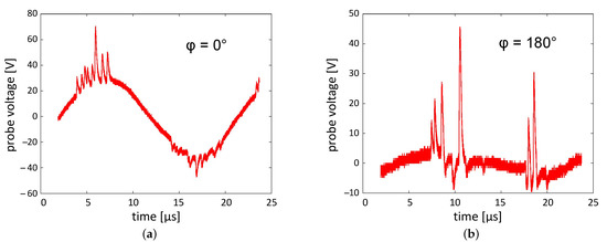 When comparing the curves for a single PCPG in Figure 3a and for two PCPGs working in phase (phase difference of 0°) as shown in Figure 4a, it can be seen that the signal components related to the PCPG oscillations are added. The amplitude for the single PCPG is about 15 V. For two PCPGs working in phase, it is doubled to about 30 V. The cathodic and anodic micro-discharge peaks occur at about the same place as a single PCPG signal, but the number of micro-discharges doubles—in the shown examples eight instead of four anodic micro-discharges and 10 instead of five cathodic micro-discharges.