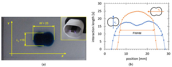 The rotational asymmetry causes the activation resulting in moving substrates depends on the movement direction. Figure 5b illustrates this dependence. Two curves represent the interaction length of a point on the substrate with the activation zone of PCPG moving relatively to the substrate surface. The position of the treated substrate point is defined on the axis perpendicular to the motion direction. The line with red bullets shows the result for substrate movement along the x-axis accordingly to the axis orientation shown in Figure 5a. The full width at half maximum (FWHM) of about 22.5 mm by such movement direction is by 40% larger than the FWHM for movement along the y-axis of 16 mm.