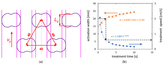 Taking into account the decrease of the activation length with decreasing treatment time, the dependence of the treatment speed is calculated and plotted in Figure 6b as the curve with blue circles. From this curve, it can be seen that the activation rate can be increased by an increase of the linear speed in the considered activation time range. It can also be shown, that if the PCPG movement speed would be higher than some limiting value the two rows of PCPG would be not enough to assure a homogeneous treatment. The treatment strips would not overlap anymore. The black arrows in Figure 6b show that the treatment width would be below 20 cm, if the treatment speed would exceed 6.3 mm/s.