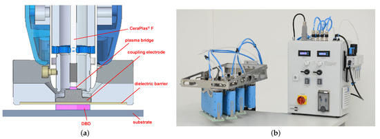 The modular treatment unit with 12 CeraPlasTM F plasma sources organized in 4 sub-units and the power and gas control unit. (a) Plasma generation principle. (b) Picture of the system.