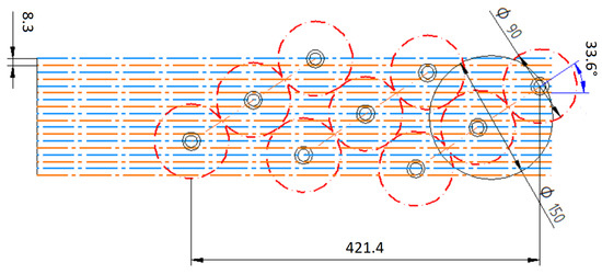 The traces of 9 PCPG-powered DBDs, each with width of 16.6 mm. The 6-inch wafer is treated in two sweeps with 8.3 mm offset: back and forth represented by blue and orange dot-dash-lines respectively. The black circles show the position of the coupling electrodes. The red dashed line circles visualize the minimum allowed tip-to-tip distance between the PCPGs.