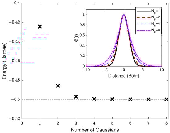 Despite the success of eFF, exactly how the scaling parameters address these approximations is not well understood. The predictive capability is limited, and its use in new regimes should always be corroborated with other models or experimental data [33]. For example, eFF was recently shown to underestimate the ion–ion correlation in dense aluminum plasma at temperatures of a few electronvolts [5,39]. While there has been some effort made to understand the effect of a pairwise exchange in dense hydrogen [22,23,24,25,40,41], the basis set limitation has not previously been investigated. However, work involving a multiple-Gaussian basis has been used to investigate wave-packet spreading in electron–nuclear scattering [33] and ionization of a single hydrogen atom [42,43], where improvements up to a five Gaussian basis were found. Figure 1 shows improvements in the ground state energy of the hydrogen atom with an increasing number of Gaussians in the electron basis; minimal improvements are observed beyond four Gaussians.