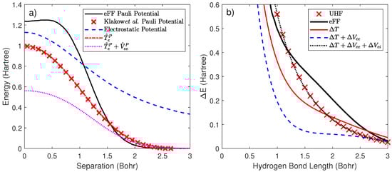 In Figure 2b, we compare the energy of the anti-bonding of the molecule with that predicted by unrestricted Hartree–Fock (UHF). For the anti-bonding case, there is no correlation, which makes it the most straightforward system to examine exchange calculations. It is clear that the kinetic energy term is dominant and primarily responsible for the Pauli exclusion principle; however, the other terms are not negligible and play important roles in stabilizing molecules and preventing Gaussian coalescence [45]. When all three Pauli energy terms are added together, the result matches the exact UHF result and establishes our Pauli potential’s validity. Note that the eFF potential, denoted by the solid black line, does not match the exact UHF result.