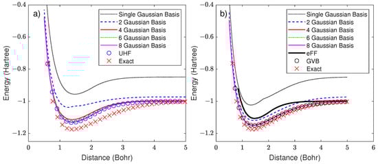 We now turn our attention to modeling the energy of the hydrogen molecule. In Figure 3 we plot the potential energy surface of and show an improvement in representation as the Gaussian basis is increased. Figure 3a displays the potential energy curve calculated without including the VB correction; in this case, the binding energy approaches the unrestricted Hartree–Fock (UHF) result. In this case, only negligible improvements are observable beyond six Gaussians, slightly more than needed to describe the hydrogen atom accurately. Figure 3b displays the potential energy curve calculated with an increasing number of Gaussians per electron, this time with the VB correction (). In this case, as the number of Gaussians is increased, the potential energy curve tends toward the generalized valence bond (GVB) result [53], validating the implementation of the multiple Gaussian basis. The eFF results, also shown in Figure 3b, lie between the one and two-Gaussian lines, clearly indicating that the scaling factors in eFF somehow address the impediment from the limited basis and lack of correlation.