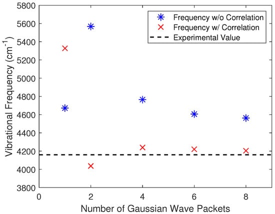 Figure 3 represents the static use of the code. To validate the dynamic component, we calculated the fundamental vibrational frequency of through the dynamical equations of motion. In the simulations, the results shown in Figure 4, the two hydrogen nuclei were separated by a small distance of 0.01 Bohr and released, the time step was 0.603 as, and the total run time was 73 fs. The energy was conserved to within Hartree. The energy was plotted versus time, creating a sinusoidal graph where the peak to peak time was averaged over ten oscillations to obtain the fundamental vibrational frequency. As we increased the number of Gaussians used, the results tended towards a consistent result. Without the VB correction, this was found to be 4563 cm, almost 10% higher than the experimental value of 4161 cm [55]. In the simulation in which correlation was accounted for, the frequency was found to be 4204 cm, just 1% higher than the experimental value. As before, a significant improvement was found when the number of Gaussians was increased from one to two.