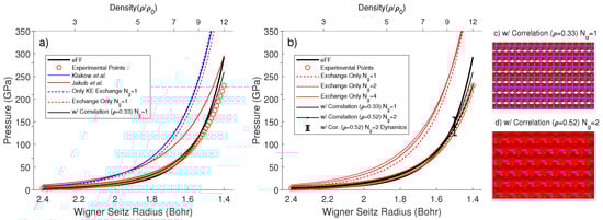 In Figure 5a, which shows only results calculated with a single-Gaussian basis, we can see that the results calculated with our pairwise exchange term diverge from those of Jakob et al. which were calculated using an exact exchange. However, with the addition of the VB correction, in this case with the scaling parameter , we were able to better match experimental results obtained on diamond anvil cells [57]. In this case, the VB correction is accounting for the pairwise exchange, the limited basis, and the lack of correlation. We note that our result follows more closely the experimental data than eFF.