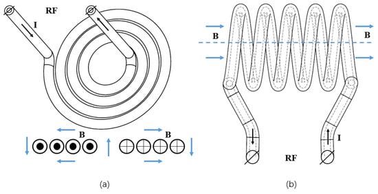 In order to excite and maintain a dense stable inductively coupled plasma, an RF antenna is needed. Generally, the RF antenna can be placed either inside or outside the discharge chamber, which is usually named the internal or external RF antenna in the ion source community. For a high-intensity high duty cycle negative hydrogen ion source, a multicusp magnet with an internal RF coil is widely used [13,14], and a copper-tube RF coil must be coated with porcelain material. When the ion source works with a high duty factor or in continuous wave (CW) operation mode, the lifetime of RF antenna will be affected, and high voltage breakdown may occur with high-input RF power. The application of an external antenna is more extensively used for plasma and ion source studies. Typical antenna coils, which are mostly cylindrical or planar, are shown in Figure 1. Kalvas et al. [15] developed a planar RF coil-driven ion source, and a milliampere H− ion beam was extracted. The ion source design is a multicusp chamber with an external planar spiral RF antenna, behind a flat AlN RF window on the back of the ion source. The maintenance interval reached one month, which was much longer than the filament-driven arc discharge ion source. Jiang et al. [16] developed a mini RF-driven ion source with 1.2 cm and 1.5 cm inner chamber diameters at Lawrence Berkeley National Laboratory. Different helical coupler antennas were tested, and high-brightness positive Ar+, Kr+, H+ ions were extracted. The mini RF-driven ion sources are capable of producing nano-focused ion beams for focused ion beam (FIB) systems.