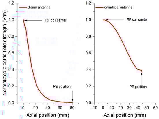 The use of RF ion sources for SIMS applications dates back to the 1960s, at the beginning of SIMS. During those years, different designs were tested. However, one of the major drawbacks of RF-produced plasma was the large energy dispersion (above tens of eV), which caused chromatic aberration and therefore limited the formation of a high-brightness high spatial resolution ion beam for micro-nano-scale applications [23,24]. Ero [25] and Levitskii [26] independently argued that the observed large energy spread anomalies are due to the modification and variation of the plasma potential by energetic electrons that have come under the influence of strong RF electric fields existing in the region between the plasma and the electrode, or between the plasma and the walls. The simulation results of the RF electric field along the central axis with different antenna structures (given in Figure 1) are shown in Figure 2. It can be seen that the RF electric field at plasma electrode (PE) position is near to zero with the planar antenna, while the cylindrical one is around 40% of the field at the RF coil center. Based on the above reasons, the planar antenna is chosen for RF power injection.
