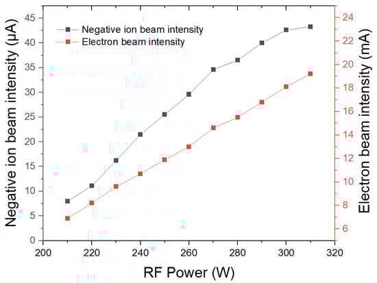 Figure 4 shows the total extracted negative oxygen beam intensity with increasing RF power. During the experiment, some parameters remained unchanged: bias voltage 26 V, ion energy 10 keV, and beam line vacuum 7.3 × 10−5 mbar. The extraction voltage was optimized to 1.68 kV. The negative ion beam intensity was measured using a Faraday cup (FC), which is placed 800 mm after GE, and the ions drift freely without focusing components. When RF power is 310 W, the maximum beam intensity reaches 43.3 μA, and electron beam intensity, which can be estimated from extraction power supply load, is close to 19.5 mA. It can be seen that electron beam intensity is two orders of magnitude higher than negative ion beam intensity. This is the main reason why a three-electrode extraction system is needed. The maximum RF power is 310 W during this experiment because the total extracted beam intensity (including electrons and negative ions) reaches the maximum load of the extraction power supply.