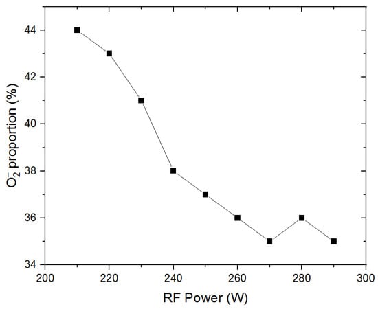 In RF oxygen plasma, and O− are the most abundant negative ions. We analyzed the beam spectrum with a Wien filter placed just before the FC, and the results are shown in Figure 5. Some unchanged parameters in this experiment are ion energy at 10 keV to meet the requirement of SIMS, PE bias voltage 26 V, extraction voltage 1.68 kV and the beam line vacuum, 7.0 × 10−5 mbar. With the increase of RF power, the proportion of in the total extracted beam decreases from 44% to 35%. This result can be explained by the fundamental processes of negative oxygen ion formation. When RF power increases, electrons in the plasma are heated by the RF field to higher energy, and the probability of Reaction (3) will increase, which results in a greater yield of O− ions. At the same time, Reactions (4) and (5) will be suppressed.