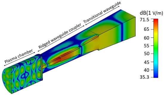 The electromagnetic simulation of the designed double-ridged waveguide coupler is shown in Figure 7. In the simulation, the impedance of the plasma chamber was assumed to be 50 Ω. The design of the coupler followed the principles of 1/4 wavelength impedance matching theory, and the length of each ridged waveguide section is equal to 1/4 guided wavelength of 2.45 GHz microwave to match the impedance of adjacent loads. The ridged waveguide coupler and microwave transition waveguide are connected by a WR-340 to WR-284 transitional waveguide.