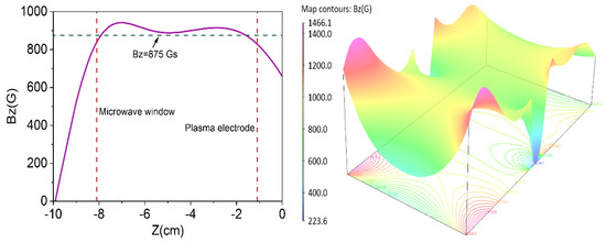 The magnetic field distribution is crucial for the generation of stable and high-density plasma in microwave ion sources. In order to form over-dense plasma in a uniform magnetic field, according to Sakudo’s study, the plasma density could be improved with the condition of BECR < B < 1.3 BECR (BECR = 875 G for 2.45 GHz microwave) [30], which would permit the propagation of right-hand polarized waves in those off-resonance regions. The calculated magnetic field distribution of our intense ion beam source is shown in Figure 8. The maximum magnetic field strength along the axial direction (Bz) is 950 G, and the ECR zone is near the microwave window; besides, as mentioned before, the stray field in the extraction electrodes region was screened to avoid the Penning discharge.