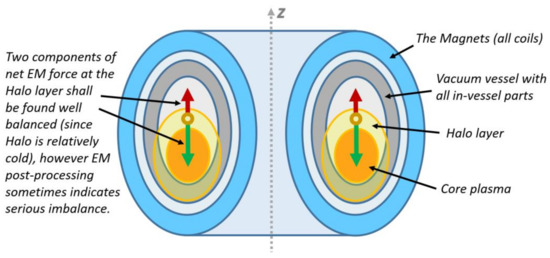 Typically, the linked plasma and EM transients are simulated with the sequential use of two codes. A code simulating the detailed plasma equilibrium and transients consistent with simplified 2D models of VV and major coils, e.g., [8], and a 3D EM postprocessing code delivering a pattern of distributed EM loads in 3D structures of VV with ports, in-vessel components, coils windings, and cases, e.g., [9]. Both codes can contribute to the remaining imbalance of net EM loads to the Halo layer as follows: