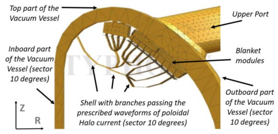 The final result needed for the engineering purposes is not just “direct” transient EM loads applied at VV (distributed and net vectors) and mirrored as net EM loads for the magnets, but also the so-called dynamic (direct EM plus inertial) interface loads acting at various supports and links (e.g., [6,7]). In many tokamaks, inertial components of VDE-induced reaction forces in VV and magnet supports have a scale similar to direct EM loads. In some tokamaks, VV and magnet supports are designed such that the inertial loads are not compensated well enough. Such tokamaks behave as “open systems” for inertial loads, and their dynamic models shall describe the tokamak and a significant part of the building.