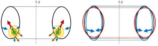 The bidirectional horizontal components of the magnetic pressure at the VV structure cannot contribute to the balance of net vertical EM forces; however, they deform the VV cross section, which slightly shifts inward, shortens in the radial direction, and accordingly elongates in the vertical direction (Figure 3). These components of EM loads, being internal to VV, grow with the CQ time scale and accordingly generate bell-like vibrations of the VV structure. This effect was mentioned for the ITER EDA, and seen well in recent dynamic simulations illustrated in next section.