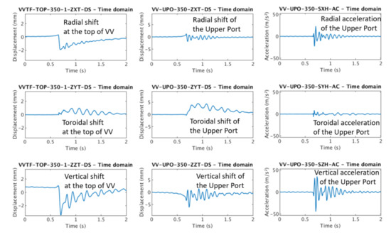 Dynamic simulations [7] demonstrate rather different characteristics of VV dynamic response in different spots: at the top of the VV and at the end of the regular upper port, both at one azimuth. This indicates a large role of bell-like vibration of VV structure. Vertical and radial aperiodic components associate mostly with direct EM loads, while lateral aperiodic- with asymmetric inertial response to symmetric EM excitation, and all periodic components- with various modes of inertial response. Courtesy of [7].