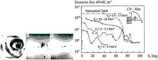 Figure 1. Typical images of the fast ion beams. Ions emitted from a 20-kJ PF device, as recorded with an axial pinhole camera and filtered track detectors: (A) 1.5-μm Al-filter, >220 keV, (B) 6-μm Al-filter, >700 keV, (C) 30 μm Al-filter, >2.1 MeV, and the angular distribution of the fast deuterons emitted from a 40-kJ NESSI experiment. Adapted from original data reported in [1,30] (reprinted with permission of IOP). - It was also proved experimentally that heavy impurity and admixture ions could be accelerated to higher energies ranging between 10 and 15 MeV [34,36]. Such ions were recorded with pinhole cameras and filtered track detectors, as well as with a Thomson-type analyzer [34]. For highly ionized (Z > 4) impurity-ions the maximum Ei/Z ratio was about 1.8 MeV, while for lower-ionized (Z < 4) species this ratio amounted to (2–2.8) MeV. Mechanisms of the ion acceleration were not identified, but taking into account that the considered ions were emitted from sub-millimeter sources, it was estimated that they were accelerated by strong local electrical fields ranging even up to 50 MV/cm.