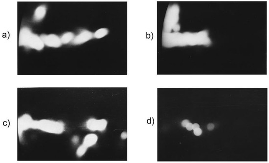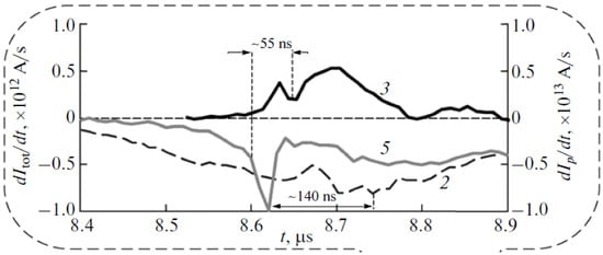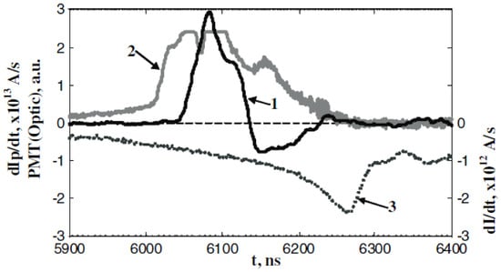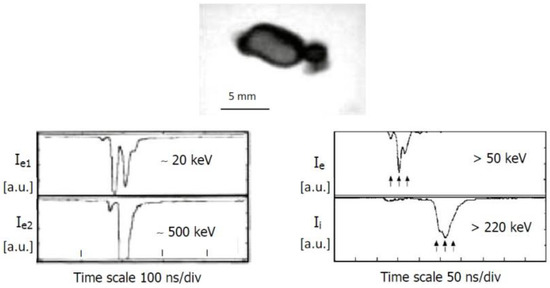 It should be noted that simultaneously with experimental studies of the ion emission from different large [51,52] and small [53,54,58] facilities there were continued theoretical analyses of ion motions [59,60]. In particular, some efforts were undertaken to explain an influence of temporal changes of the current filaments on trajectories of the emitted ions. Characteristics of the pulsed ion beams emitted from different small PF devices were compared [61] and measurements of charged-particle beams (i.e., ions and electrons) from PF discharges were carried out [62]. There were observed correlations of the ion beams (emitted mainly along the z-axis) and fast electron beams (emitted in the upstream direction through an axial channel in the anode). Some examples are presented in Figure 2.