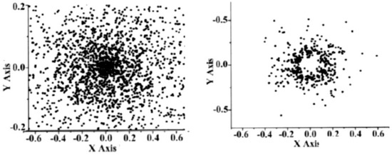 Tracks of the fast deuterons on the plane perpendicular to the z-axis, which were computed for two pinch configurations: at the presence of the central axial filament (left) and for the case without the central filament (right). Adapted from original data reported in Figure 4 of [63] (Nukleonika 2001, 46, S29–S32).