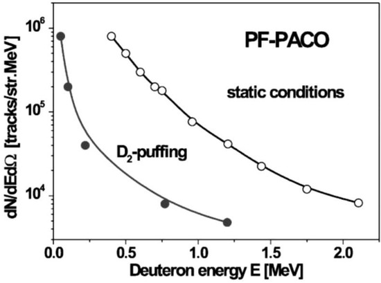 - Numerous PF experiments showed that the highest ion emission was recorded at pressures lower than that corresponding to the maximum fusion-neutron yield. This ion emission was usually peaked at the z-axis, but in many cases it showed a strong asymmetry [1,30]. The total deuteron yield depended on experimental conditions, i.e., energy delivered from the condenser bank, the initial pressure, etc. [25,36,43]. It was deduced that the fast neutrons from d-d fusion reactions in PF discharges were produced mainly by deuterons of energy (20–100) keV [32,42].