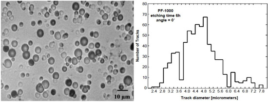 An important direction of the ion studies was research on interactions of intense ion-plasma streams with different targets irradiated in the PF-1000 facility [73]. The chosen nuclear track detectors, which were covered with some filters and placed upon a semicircular support (in front of the electrode outlets), made it possible to determine the angular distribution and energies of the recorded ions (mainly protons or deuterons). Advantages of the use of nuclear track detectors were also demonstrated in measurements of fusion-produced protons emitted from the PF-1000 facility [74]. In that case, samples of the PM-351 detector were covered with 80- or 100-μm-thick Al-foils (which protected those detectors from direct plasma interactions and stopped almost all fast deuterons) and placed at different angles to the z-axis. The microscope analysis of the etched tracks made it possible to determine numbers of proton tracks of different diameters, as shown in Figure 5, and to estimate the numbers of the recorded protons.