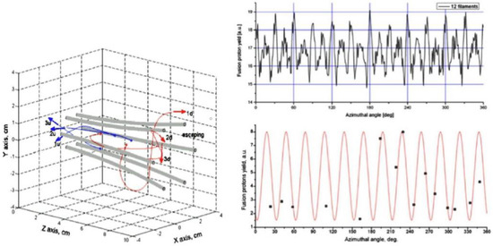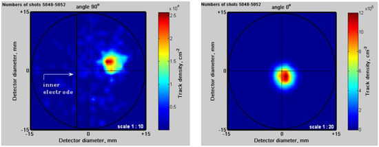 The reported experimental studies were supported by numerical modeling of deuteron motions in a filamentary PF pinch column [63]. Since earlier studies showed that current filaments could exist inside two (or three) cylindrical plasma layers, as well as at the z-axis, computations were carried out for different numbers and spatial distributions of the filaments, as well as for different initial energies of the deuterons. It was shown that the formation of the central axial filament changed the angular distribution of the emitted deuterons very strongly. In such a case this distribution was peaked at the z-axis, while in the case without the central filament the deuteron distribution had a ring-like shape, as shown in Figure 3.