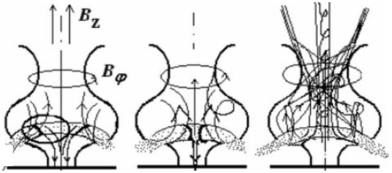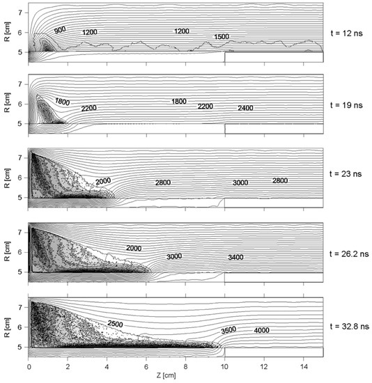 - The initial plasma sheath gets detached from the insulator and gets accelerated by magnetic pressure, turns around the anode corner and moves towards the axis in a characteristic curved shape.