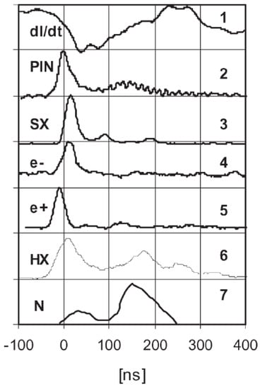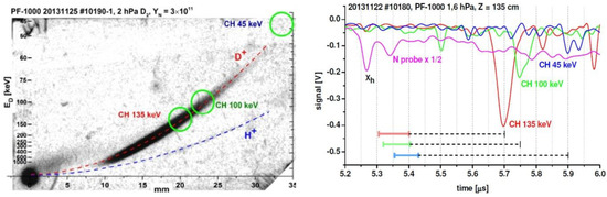 In the same PF experiment [62] it was determined that the FWHM value of a single ion pulse was about 20 ns, and the energy spectrum of the recorded deuterons with the maximum at (400–500) keV was extended up to above 1 MeV.