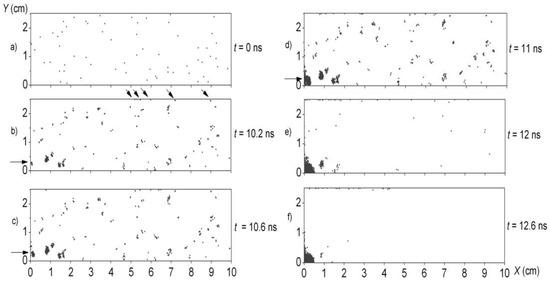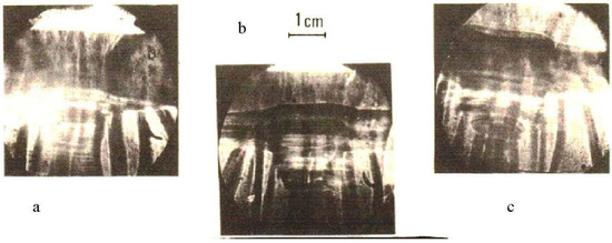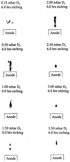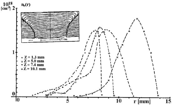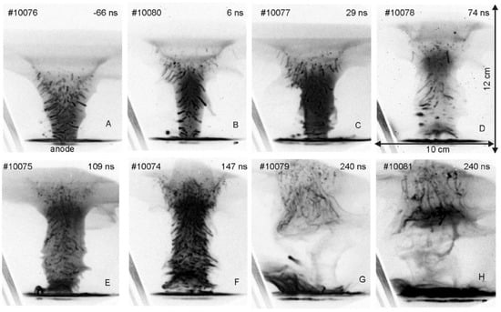 Very important information was obtained from time-integrated measurements of fusion-produced protons emitted from PF-360 and PF-1000 facilities [76]. On the basis of the pinhole images recorded at different angles, it was shown that the fusion-protons were emitted from small (sub-millimeter) regions localized mostly around the electrode axis, at a distance of a few centimeters from the anode surface, as shown in Figure 6.