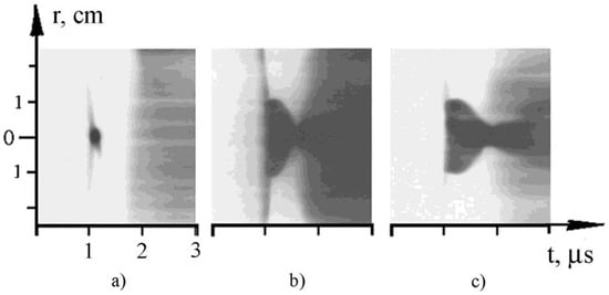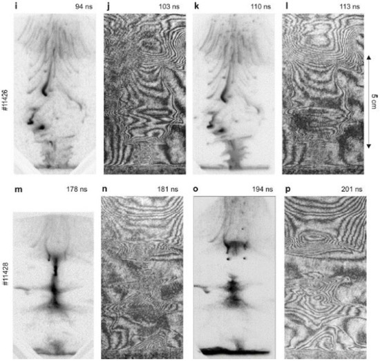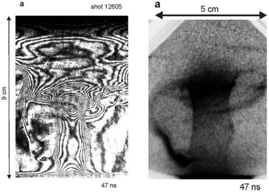 - Krauz, V.I.; Levashova, M.G.; Karakin, M.A.; Krokhin, O.N.; Lisitsa, V.S.; Mokeev, A.N.; Myalton, V.V.; Nikulin, V.Y.; Oginov, A.V.; Smirnov, V.P.; et al. Influence of the radiation of the plasma-focus current sheath on the implosion dynamics of condensed targets. Plasma Phys. Rep. 2008, 34, 43–51. [Google Scholar] [CrossRef]