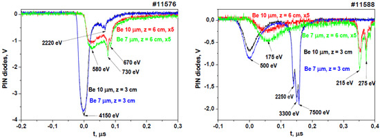 - Dan’ko, S.A.; Krauz, V.I.; Myalton, V.V.; Zhuzhunashvili, A.I.; Vinogradov, V.P.; Kharrasov, A.M.; Ananev, S.S.; Vinogradova, Y.V.; Kalinin, Y.G. Study of Soft X-ray Emission during Wire Array Implosion under Plasma Focus Conditions at the PF-3 Facility. Plasma Phys. Rep. 2015, 41, 882–894. [Google Scholar] [CrossRef]