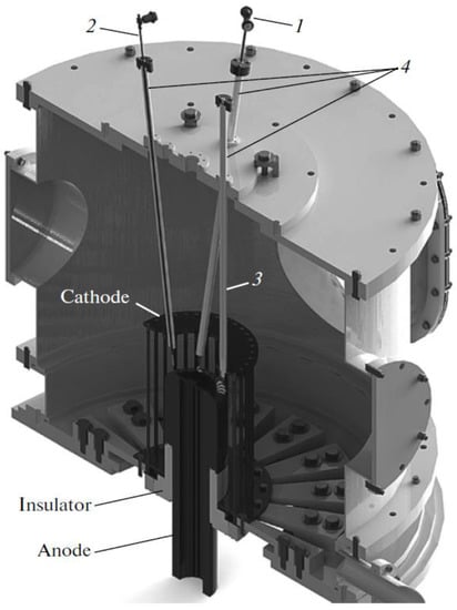 - Vinogradov, V.P.; Nashilevskii, A.V.; Krauz, V.I.; Remnev, G.E.; Vinogradova, Y.V.; Kanaev, G.G.; Mitrofanov, K.N.; Myalton, V.V. Development and study of a portable plasma focus neutron source. Plasma Phys. Rep. 2014, 40, 146–159. [Google Scholar] [CrossRef]