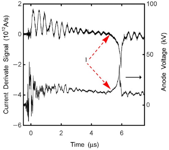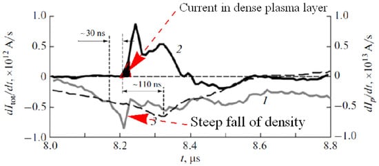 - The current flows behind the dense plasma sheath until it approaches the axis. The moving current layer acts as a time-varying inductance that increases as the plasma approaches the axis. A characteristic sharp dip in the current derivative signal and a spike in the voltage across the electrodes occur as the plasma reaches the axis.